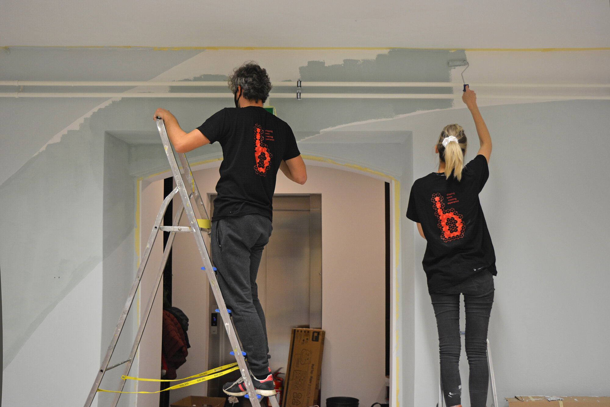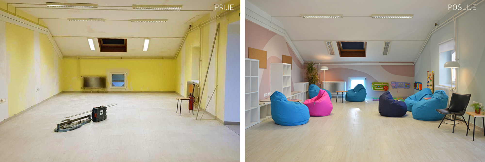 Tijekom dva dana (11. i 12. prosinca) intenzivnog rada, knjižnicu smo preurediliu fleksibilan prostor koji se lako transformira s obzirom na različite namjene, u čitaonicu, u igraonicu, prostor za goste i prostor za predavanja. Knjižnica tako sada ima zonu za učenje, površinu za igru i čitanje, prostor rezerivan za stručnu literaturu i predavanja, te dio odijeljen zavjesom koji može funkcionirati kao spremišni dio (za stolove i stolice) ili se rastvoriti kada je potreban veći prostor za radionice i predavanja.