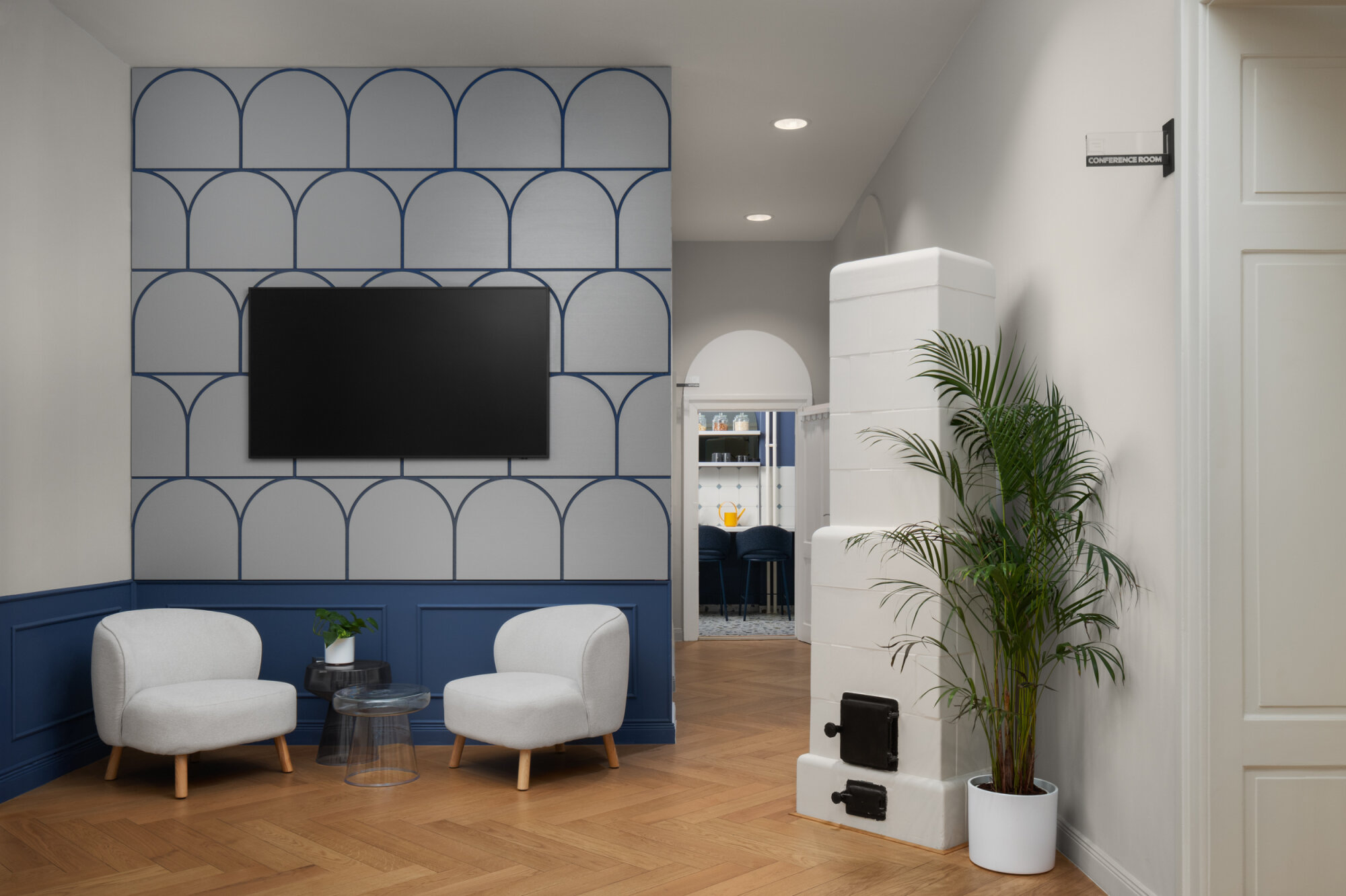 The project is set within a well-preserved and restored Secession building, and is defined by a concept we developed under the name Tech Nouveau, a contemporary interpretation of Secessionist elements expressed through a modern design language. Within the interior, we reinterpreted classic forms and ornaments from the early 20th century.