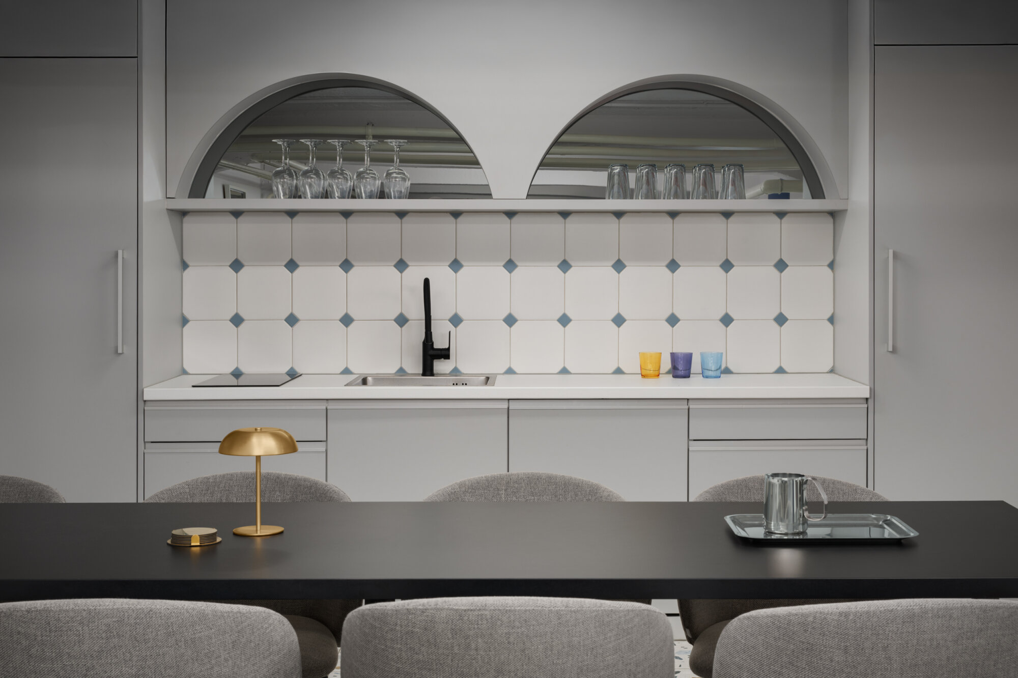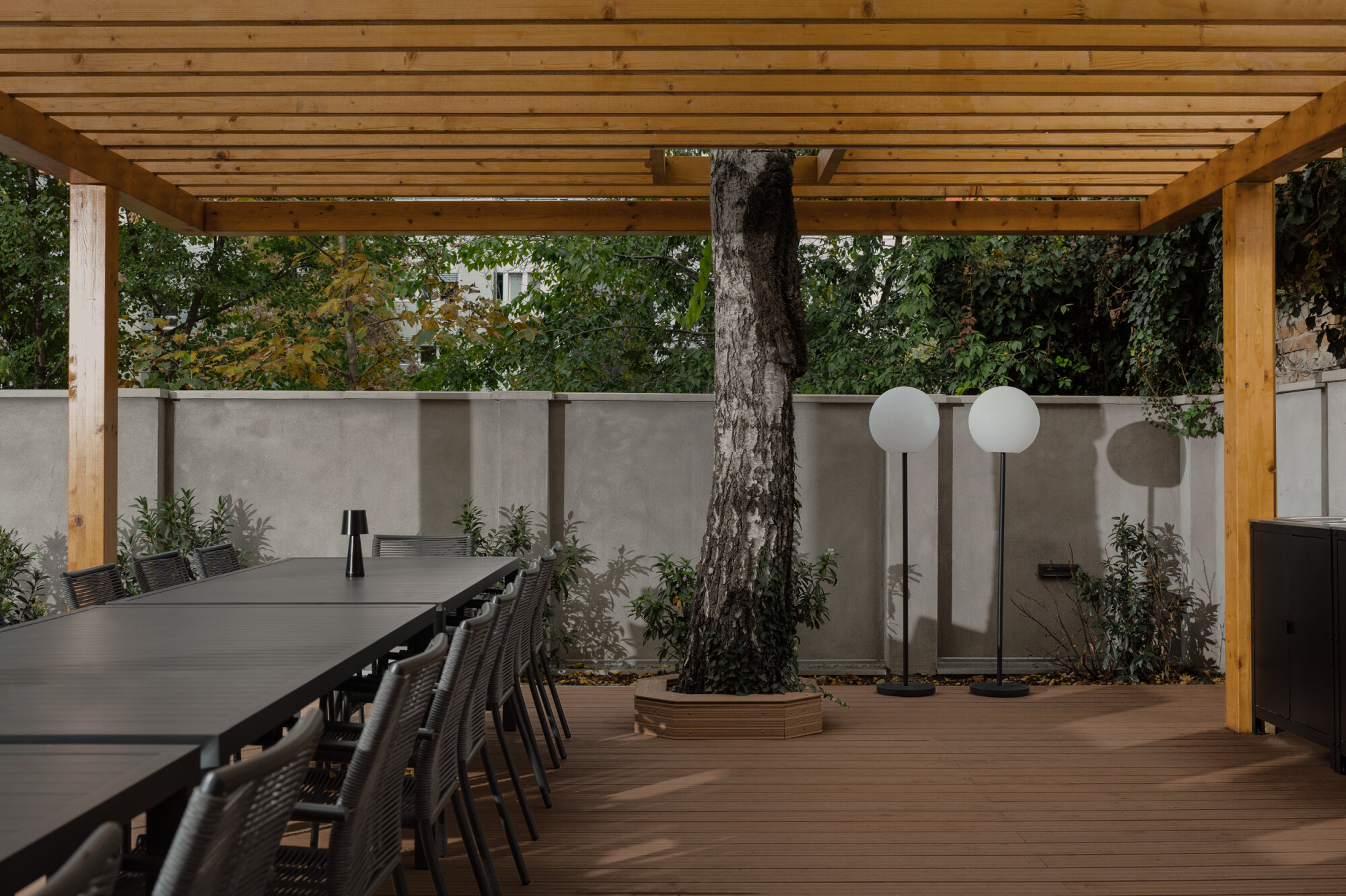 The working areas were kept simple, with a focus on comfort and concentration. At the same time, particular value is placed on the outdoor garden - a green oasis with a wooden pergola that provides shade and a sense of calm. The basement adds another distinctive layer to the project, transformed into the DICE Club - a shared dining area and a space for after-work gatherings. Although lower in height and inherently darker in character, it has been enhanced with oval mirrors and ambient lighting, making it unexpectedly inviting and attractive.