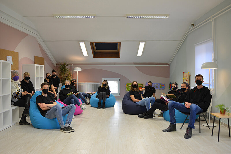 Tijekom dva dana (11. i 12. prosinca) intenzivnog rada, knjižnicu smo preurediliu fleksibilan prostor koji se lako transformira s obzirom na različite namjene, u čitaonicu, u igraonicu, prostor za goste i prostor za predavanja. Knjižnica tako sada ima zonu za učenje, površinu za igru i čitanje, prostor rezerivan za stručnu literaturu i predavanja, te dio odijeljen zavjesom koji može funkcionirati kao spremišni dio (za stolove i stolice) ili se rastvoriti kada je potreban veći prostor za radionice i predavanja.