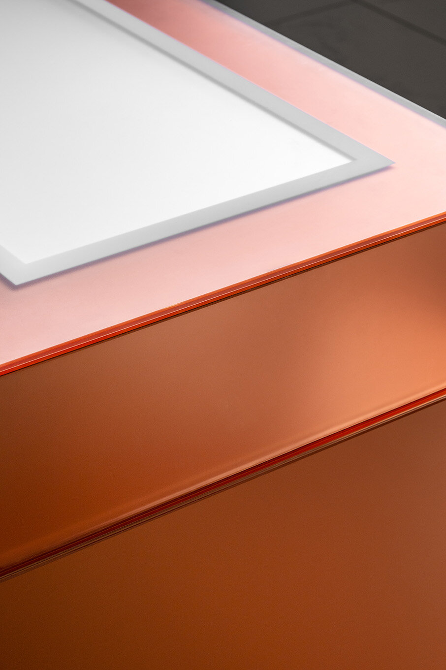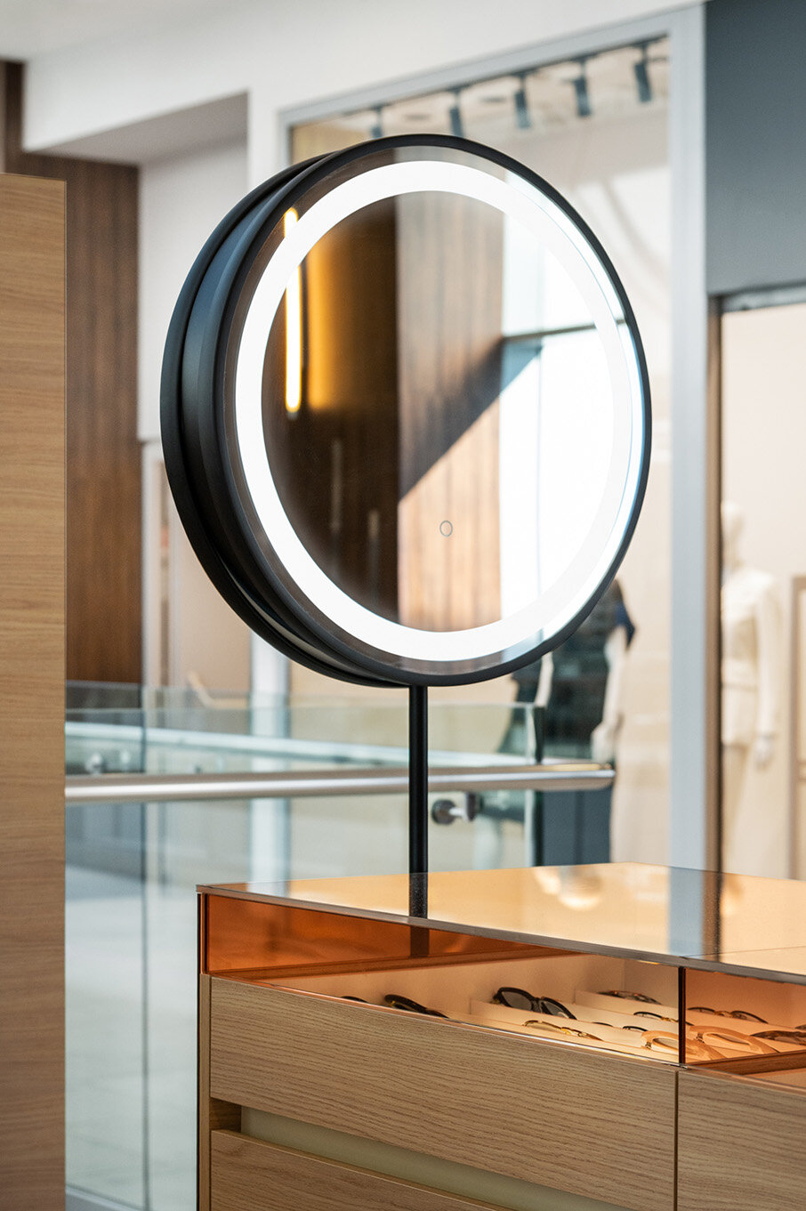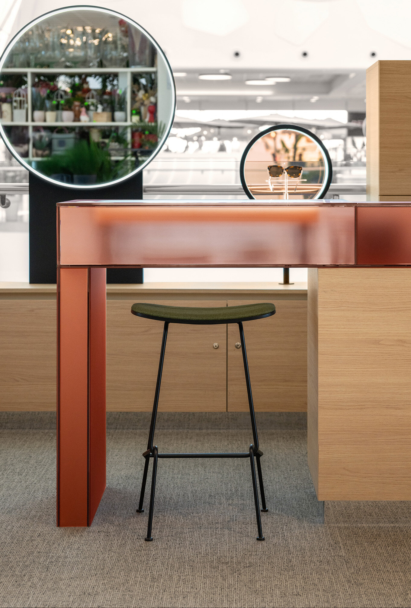 This new installation brings an elevated look & feel, blending refined materials and finishes into the brand’s established design language. A standout feature of the design is the extensive use of glass, not just as a decorative element but also as a structural one. From clear to frosted and colored glass, the material adds sophistication and a jewelry-like quality that enhances the spatial experience. From a functional standpoint, the main challenge of this project was creating a fully functioning retail environment within an open space. The pop-up includes a range of modular elements that serve as product displays, storage, testing zones, and sales support, while remaining open and accessible to shoppers circulating through the surrounding shopping center.