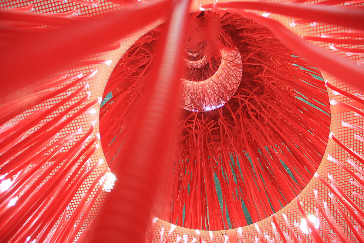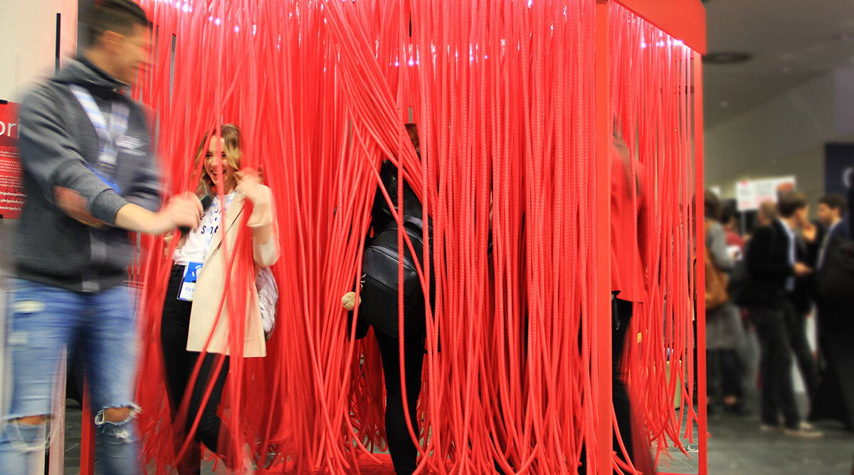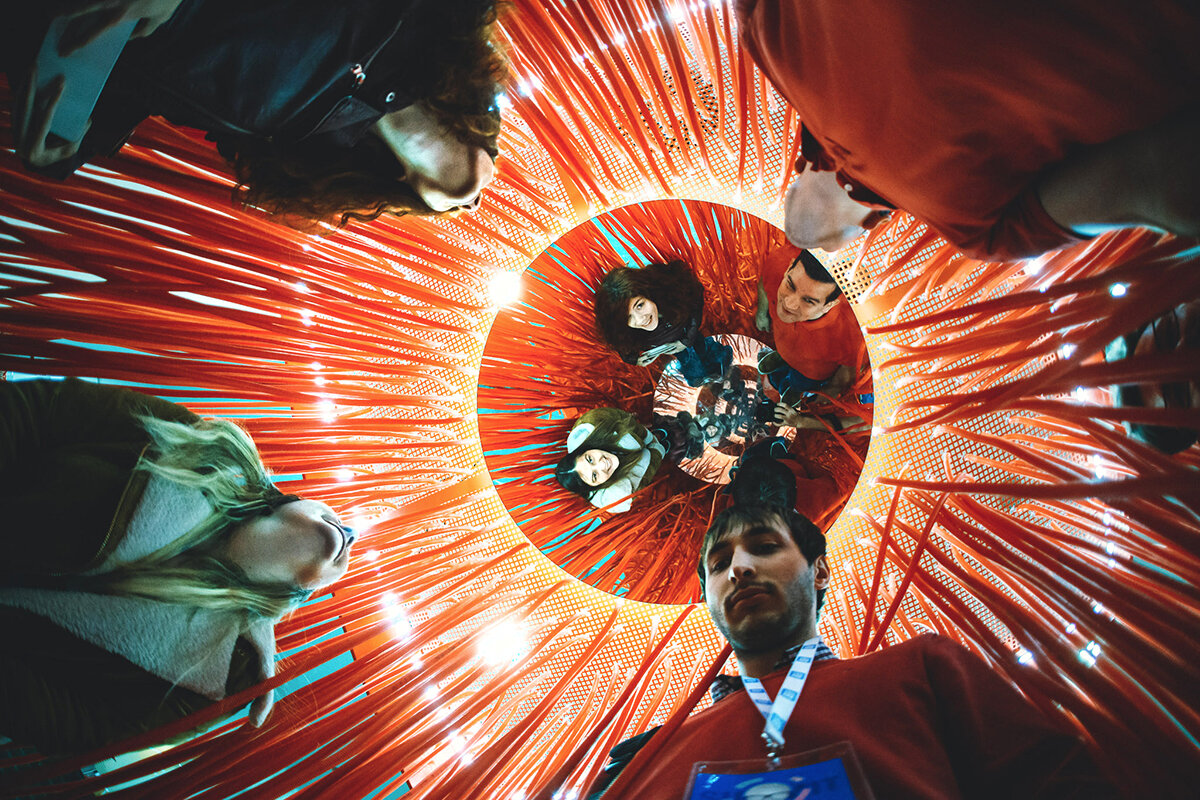A corresponding mirror is placed in the center of the upper frame, creating an infinity effect. LED light strips line the upper frame and surround the central mirror. The experience is centered around the sensory interactions of touch, sight, and sound. Although at first glance visitors are not sure what the booth represents, they are nevertheless intrigued to enter and push their way through the hanging tubes. Once they reach the center, they find themselves in the middle of the infinity effect of the juxtaposed mirrors that causes visitors to leave reality even if for just a moment. The tubes create an acoustic effect, blocking out the noise and commotion from the outside world as well as creating their own sounds when knocked into one another.