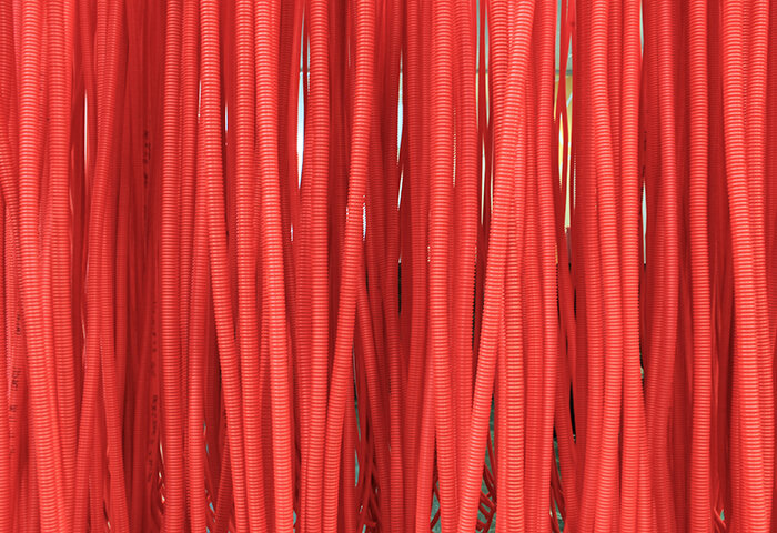 When confronted with the task of designing our very own stand, we decided to take the same approach and create a distinct spatial experience within less than 5 m2. The signature red booth is created within a steel cube frame that serves as the structure to hold more than 800 hanging pipes attached to a metal mesh, creating a barrier between the stand’s interior and the outside world. The booth flooring is covered in soft red carpet, in the middle of which is a round mirror.