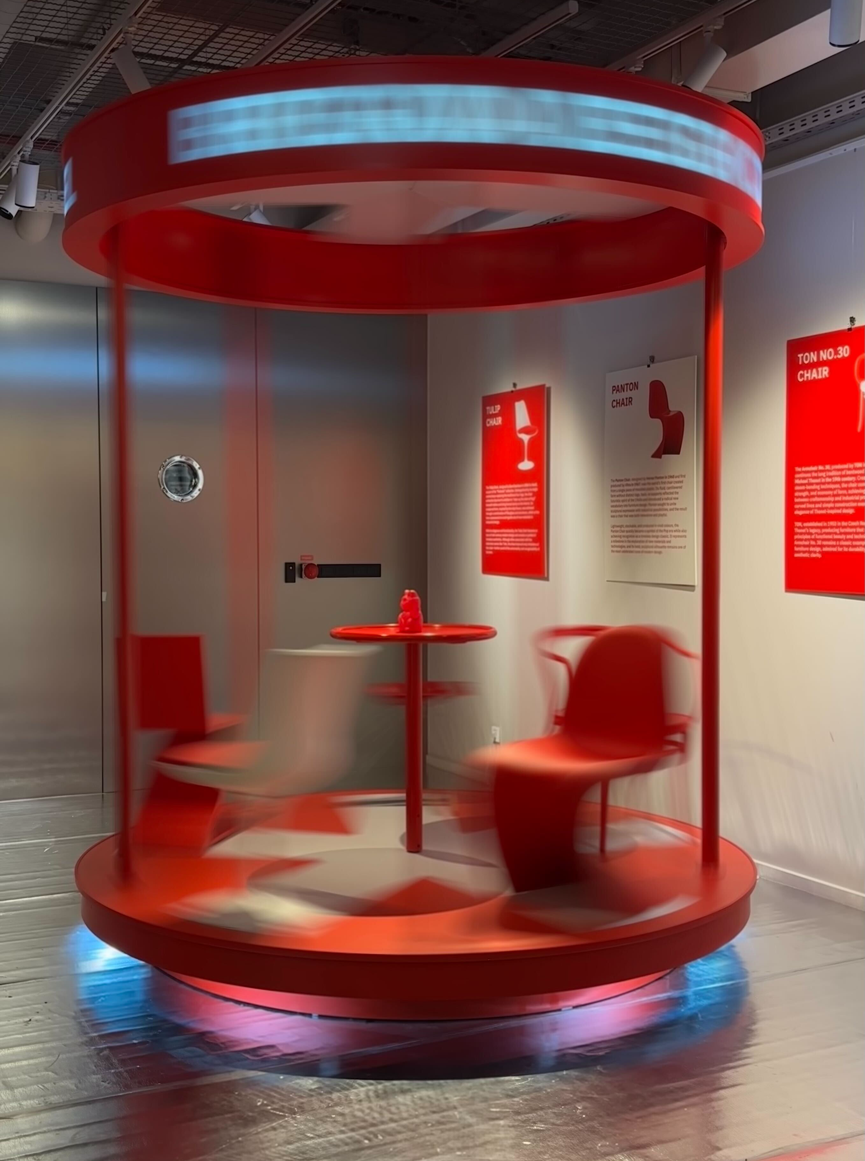 The installation takes the form of a carousel that guides visitors through five milestones in furniture design: Ton No. 30 (1859), Zig Zag (1934), Tulip (1956), Mezzadro (1957), and Panton (1967).