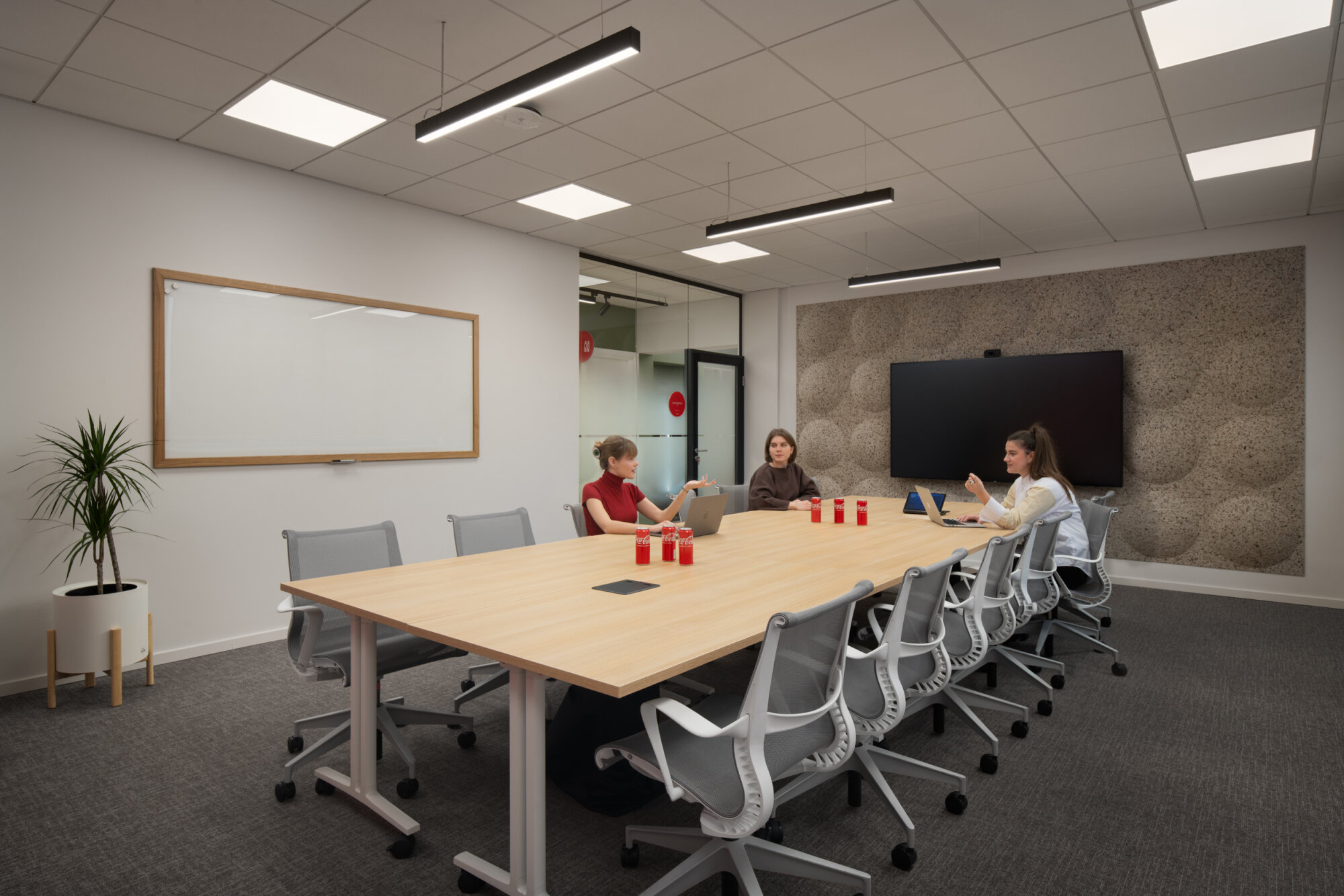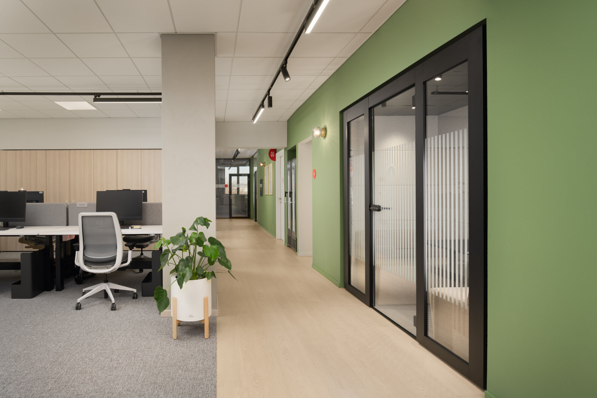 Natural materials and biophilic elements are seamlessly integrated, fostering a deeper connection to nature while promoting a sense of calm and wellbeing. Graphic details inspired by local culture and identity add a unique layer of character, making the office both relatable and distinctive. Adaptability and comfort are at the forefront of the design, with ergonomic, activity-based furniture that supports various workstyles. A light color palette paired with natural finishes enhances the sense of openness, while acoustic solutions ensure a peaceful and focused environment.