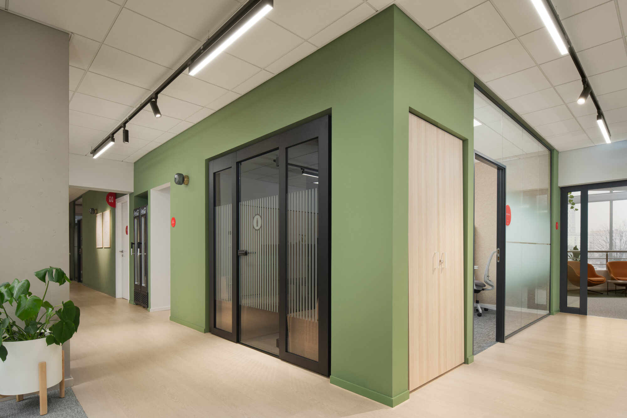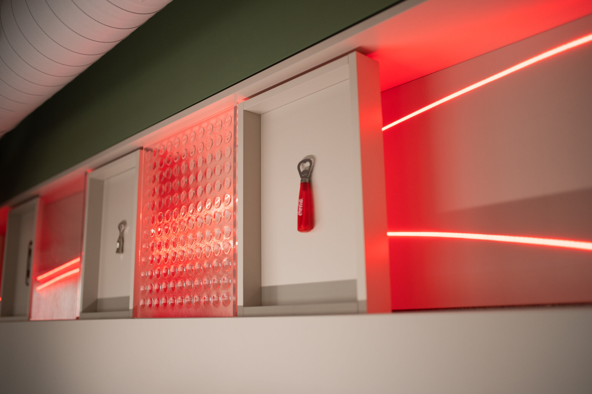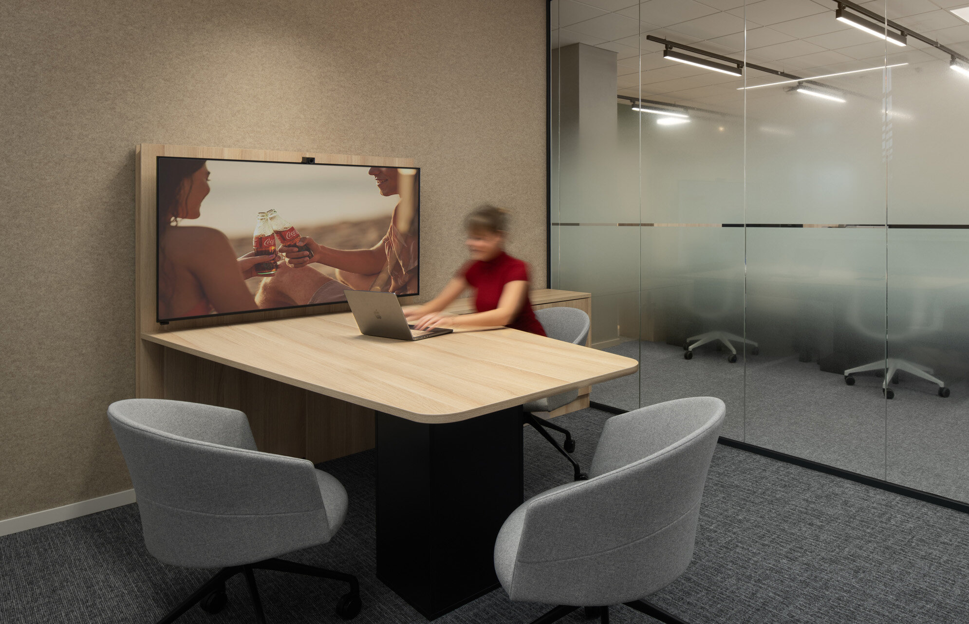 The Coca-Cola Adria office in Zagreb showcases a thoughtful approach to modern workplace environments, emphasizing quality, functionality, and employee wellbeing. The space is carefully crafted to achieve a harmonious balance between warm tones and accent colors, creating a welcoming yet professional atmosphere.