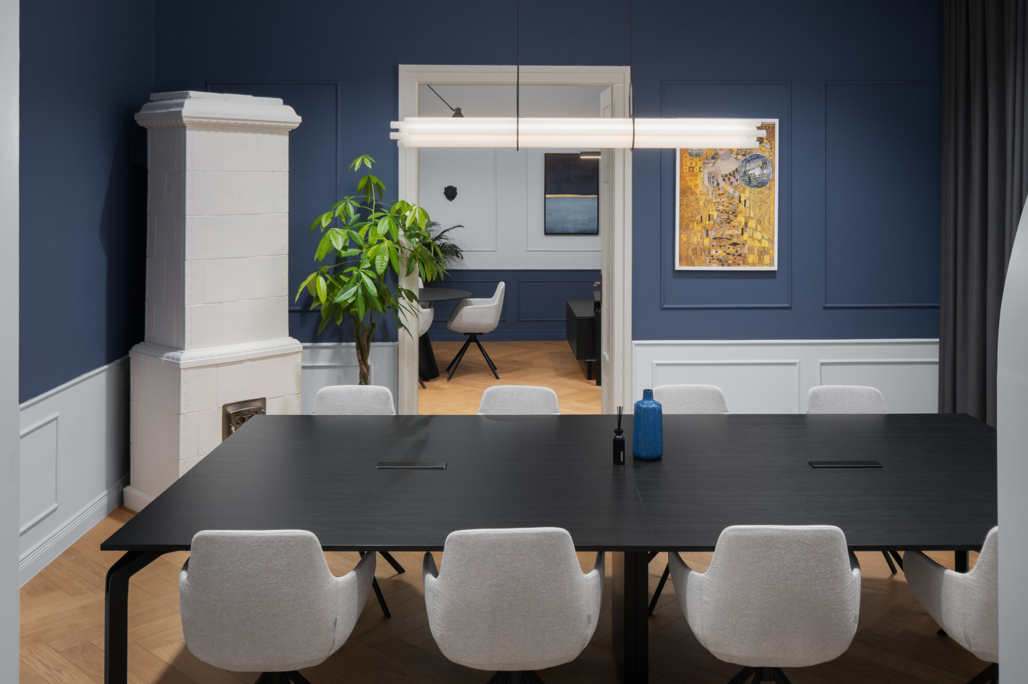 The project is set within a well-preserved and restored Secession building, and is defined by a concept we developed under the name Tech Nouveau, a contemporary interpretation of Secessionist elements expressed through a modern design language. Within the interior, we reinterpreted classic forms and ornaments from the early 20th century.