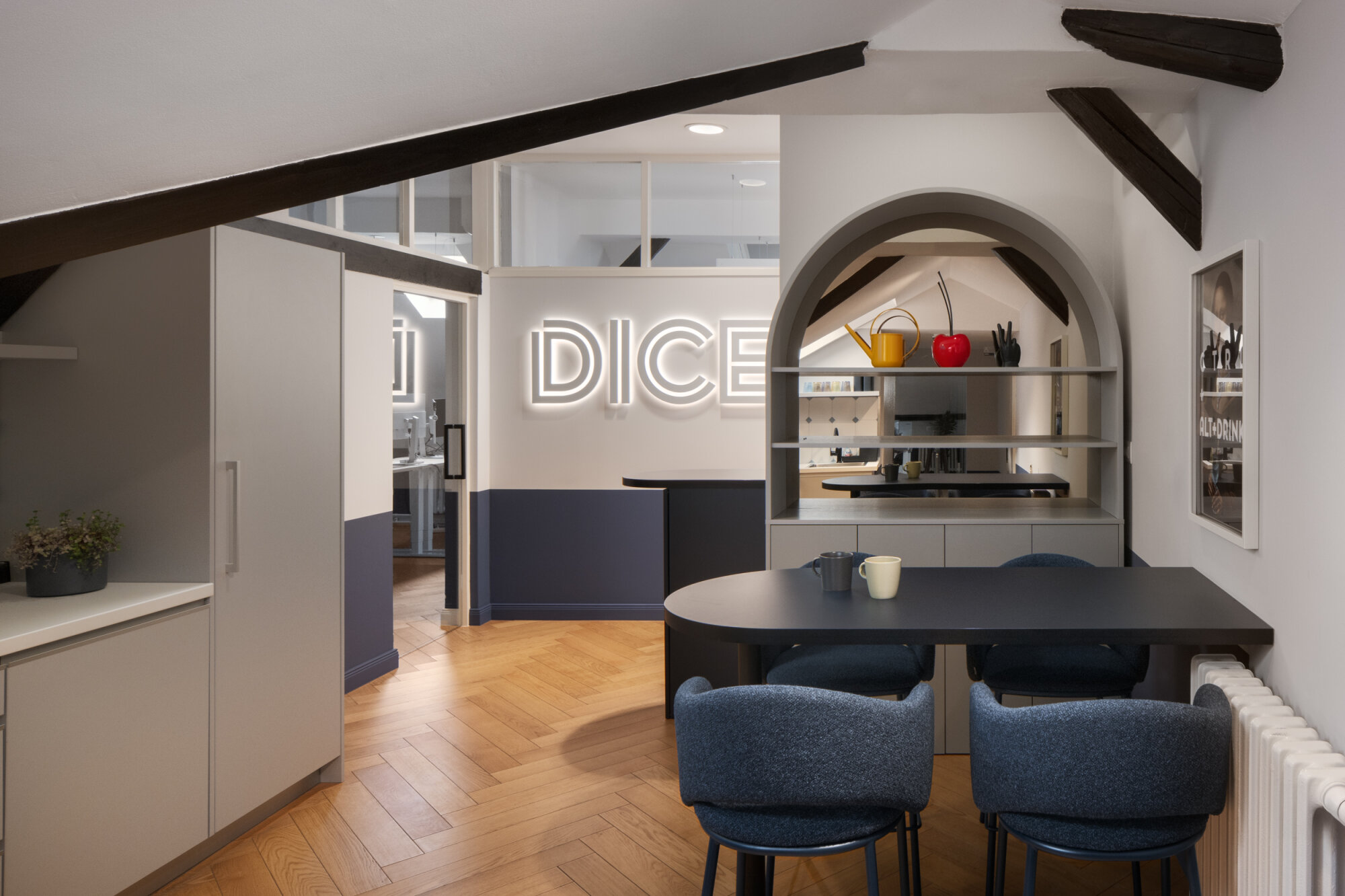 Our goal was to respect the context of the location and its historic architecture, while creating a functional, contemporary workspace that supports the everyday needs of its users. At the same time, we wanted to introduce an element of informality - something that allows for relaxation and play. This layer was further enriched by DICE’s internal team, who developed a series of engaging spatial details and accents, combining well-known artworks with internal jokes in the form of images and posters.