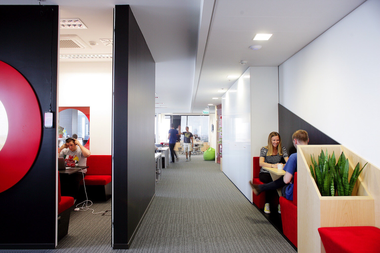To address this need, we introduced two phone booths strategically placed in zones that are often underutilized, such as hallways and corners. The so-called Chill Zone, conceived as a communal area for employees, is incredibly versatile and adaptable to various occasions. Here, employees can take a break, catch up on lectures and seminars, or even socialize. The presence of modular desks and a kitchen area with a bar table adds further flexibility, allowing these spaces to transform seamlessly into hubs for social interaction, entertainment, and larger gatherings.
