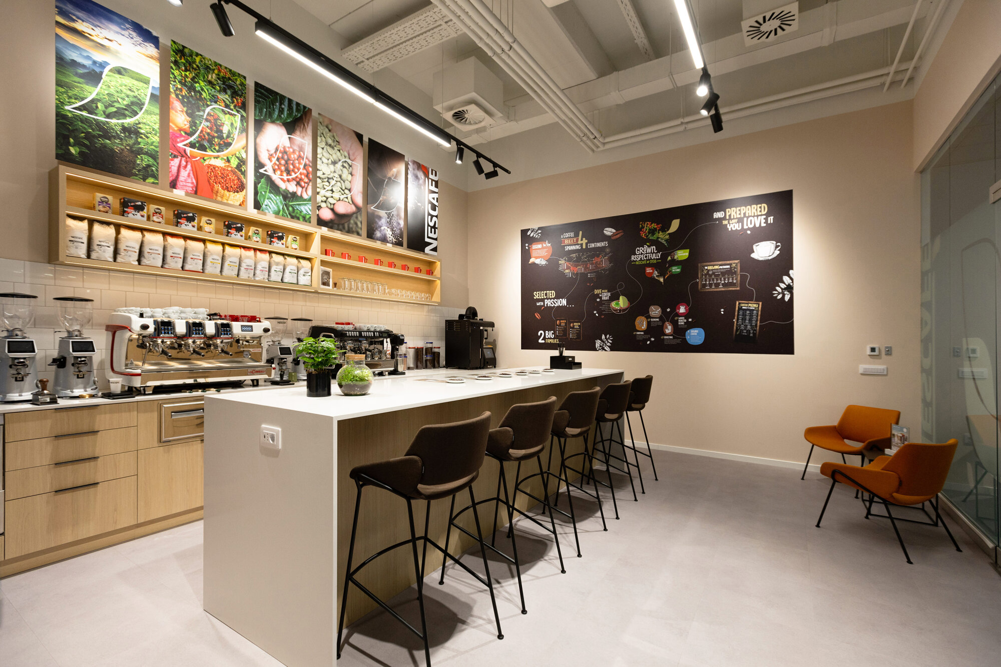 Together with the kitchen and kitchen island, the Training Room features a small lounge area, an educational brand wall, and a few more equipment part of the brand's offer for the B2B market. The overall look and feel of the Training Room had to balance warmth and a contemporary corporate look while at the same time using the brand's color palette and design language. Thanks to its strategic position within the Nescafe headquarters and its warm corporate look and feel, the activities carried out in the Training Room extend way beyond the initial desired scope. Office networking and team building, internal one-on-one meetings, or private client presentations are only a few of the activities currently carried out in what was supposed to be a space limited to client presentations and demonstrations.